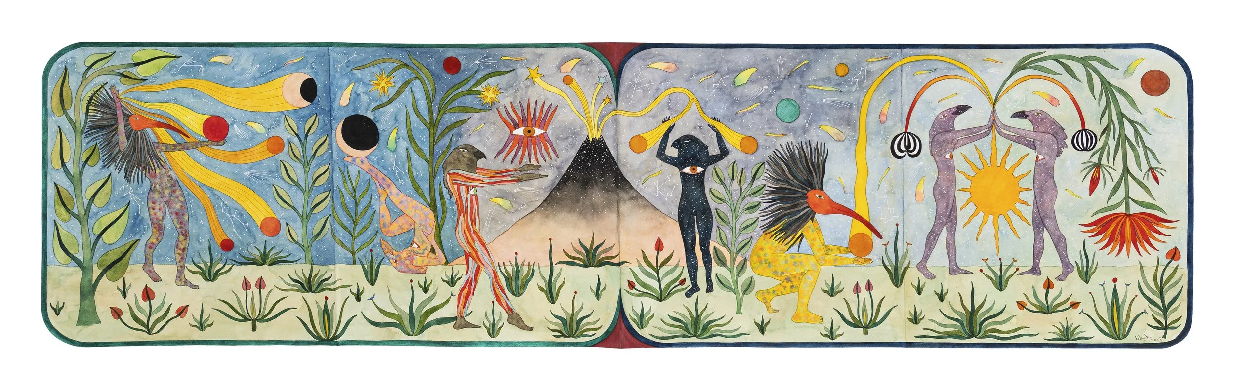Rithika Merchant, Fieldwork, 2025, gouache, watercolour, ink and gel pen on paper, 14¾ x 54¾ in.