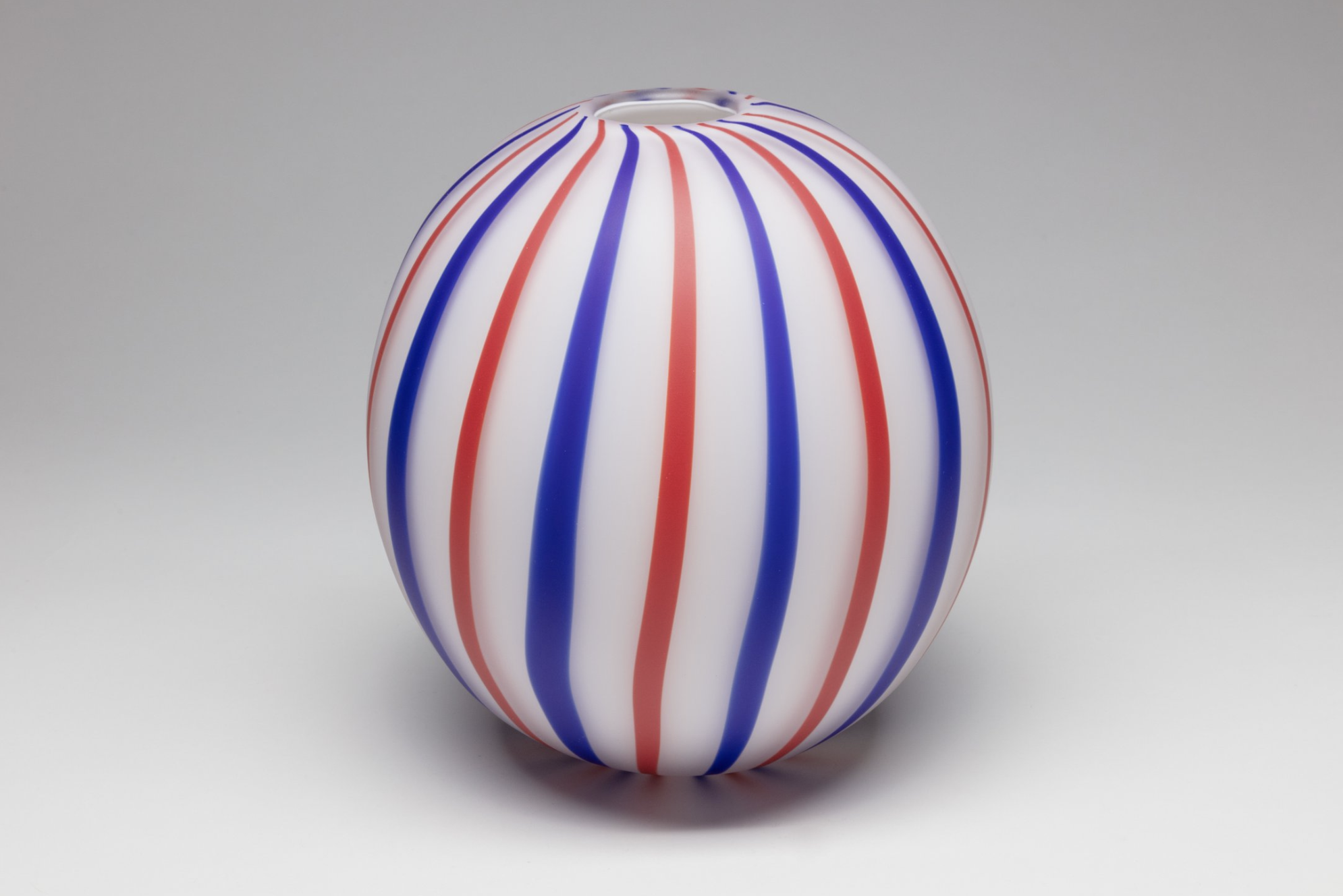 Inside the main gallery, viewers are immersed in Red Star’s bead exchange. Watercolor paintings documenting 200 different types of beads are displayed in monumental grids. On the floor of the gallery, larger-than-life replicas of the beads are displayed on Hudson Bay point blankets, red wool blankets with black stripes that recall the original context in which beads changed hands. These beads were each hand-blown using traditional methods and made to match surviving examples of each bead type as closely as possible.