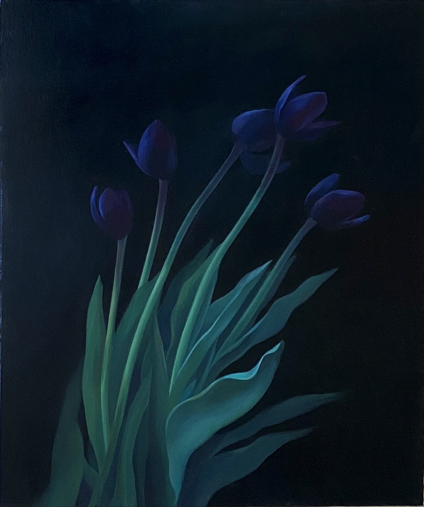 The darker works, all featuring black tulips on a black ground, are a particular fascination of Twilley’s. They are painted from photographs but refined through various sketches, and develop gradually over many months. So dark that they are almost difficult to discern at first glance, they are a meditative practice for the artist and subvert our expectations of what a still life should be.